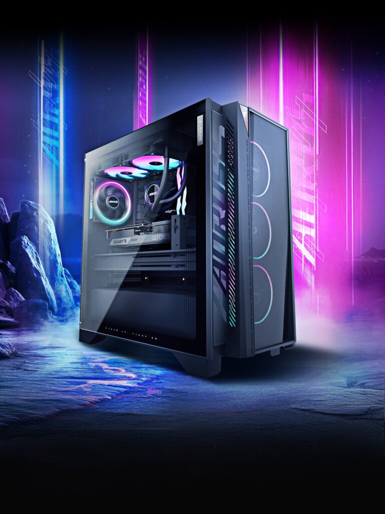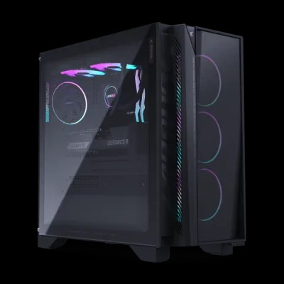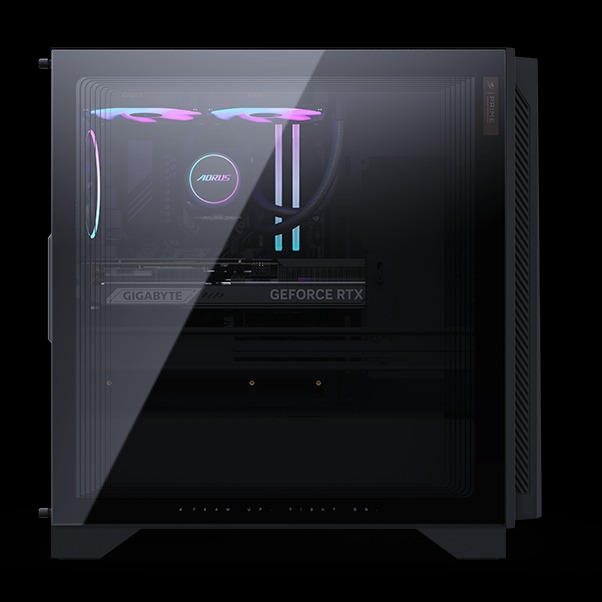 The AORUS PRIME 5 is distinctly AORUS, featuring sleek contours, bold RGB, and a tempered glass side panel that elevates any gaming setup.