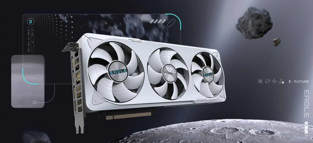 The frontal design boldly integrates aerospace and sci-fi elements, clearly showcasing the distinctive EAGLE style, while maintaining a cohesive aesthetic with the motherboard product line. This ensures a unified design language and reinforces product family identity.