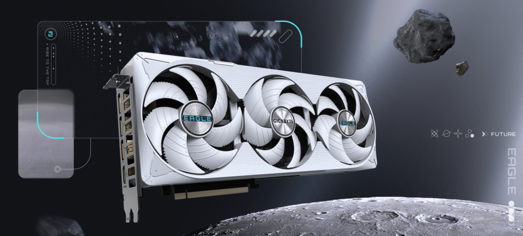 The frontal design boldly integrates aerospace and sci-fi elements, clearly showcasing the distinctive EAGLE style, while maintaining a cohesive aesthetic with the motherboard product line. This ensures a unified design language and reinforces product family identity.